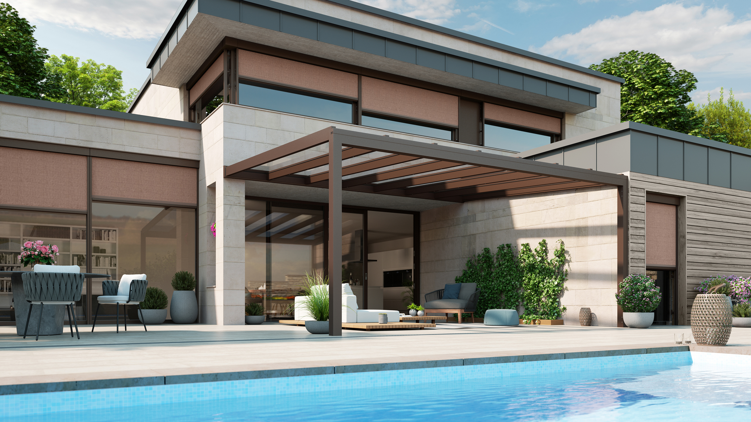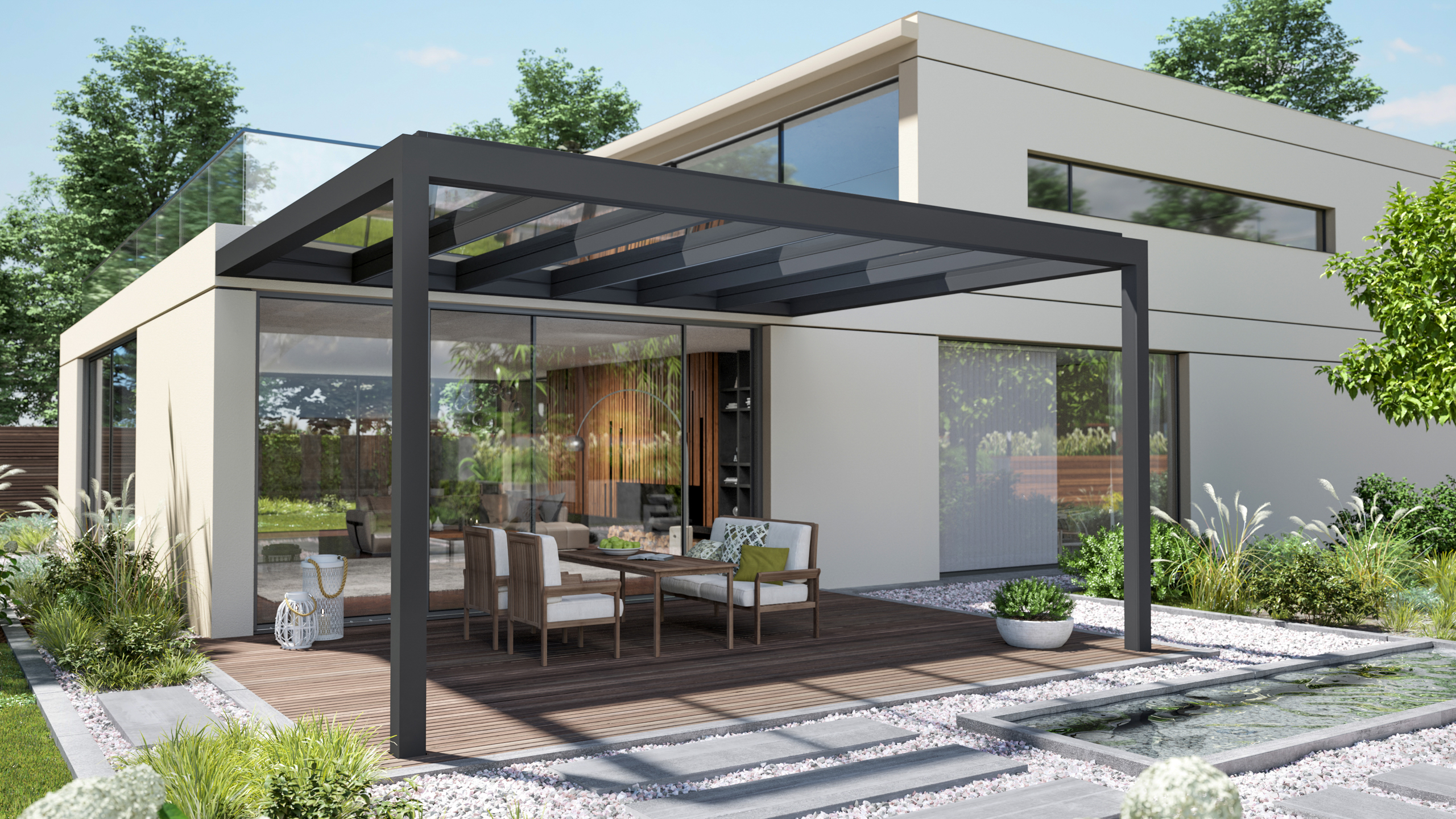 Hier verschwimmen die Grenzen von innen und aussen. Ob mit oder ohne Sonnenschutz, ob mit oder ohne Seiten- und Frontverglasung, ob mit oder ohne LED-Beleuchtung und automatischer Steuerung: Ästhetik und Design in Glas lassen weiter sehen – und freier fühlen.
