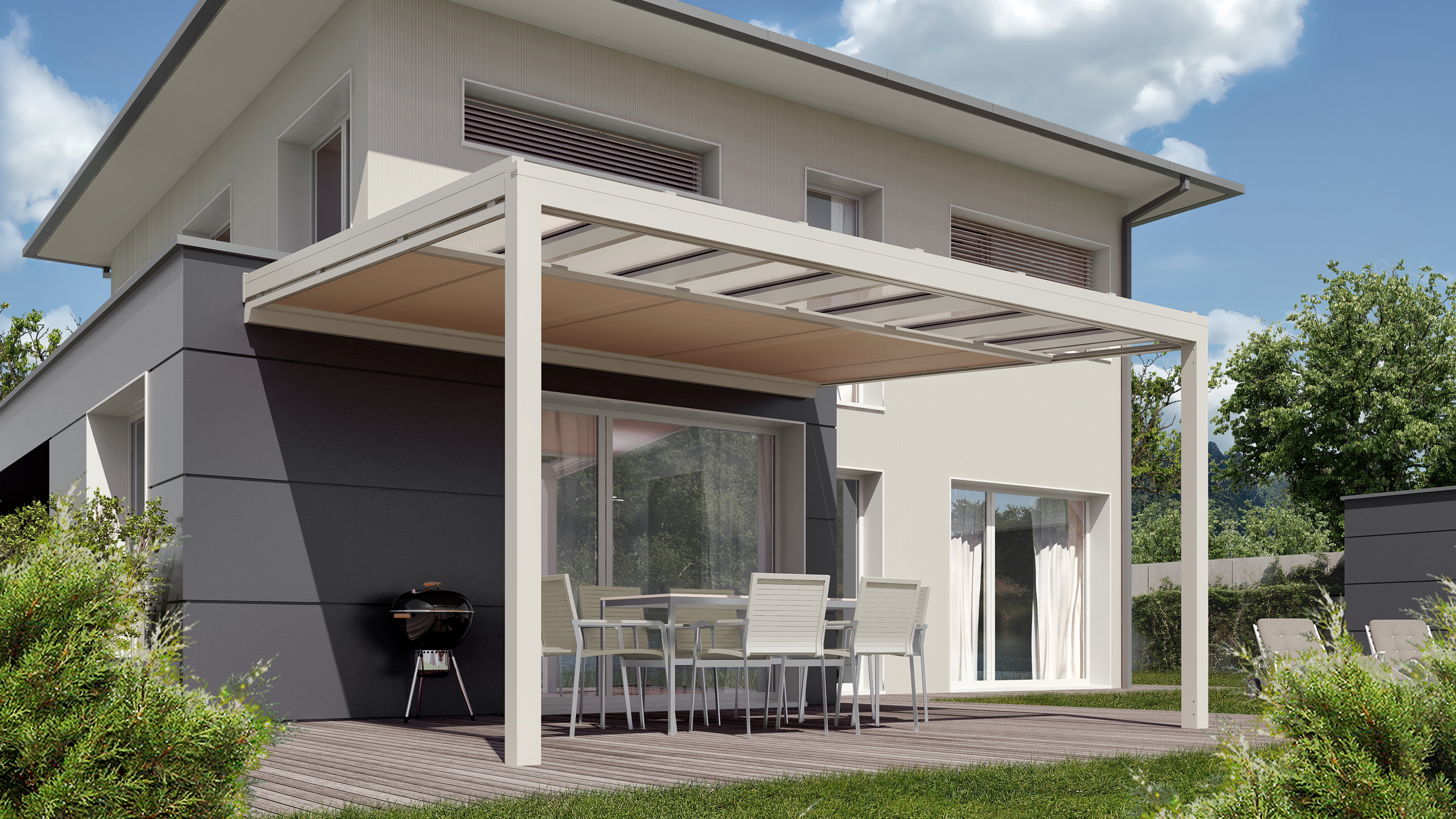 Im Unterschied zu einem festen Vordach schenkt Ihnen die Terrassenüberdachung aus Glas selbst an trüben Tagen Licht und damit mehr Lebensqualität. Dank der harmonisch integrierten Beschattungsoptionen können Sie je nach Wunsch und auf Knopfdruck das ideale Licht-Schatten-Verhältnis bequem selbst wählen.