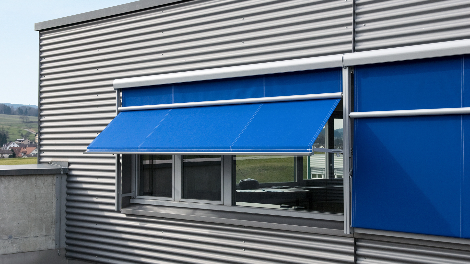 und Ausstellmarkise, einer stufenlos einstellbaren Ausstellwinkelposition von 0° bis 180° und dem frei wählbaren Ausstellpunkt, bietet diese Fassadenmarkise auch bei grossen Fensterflächen eine optimale Abstimmung zwischen Tageslicht und Schatten.