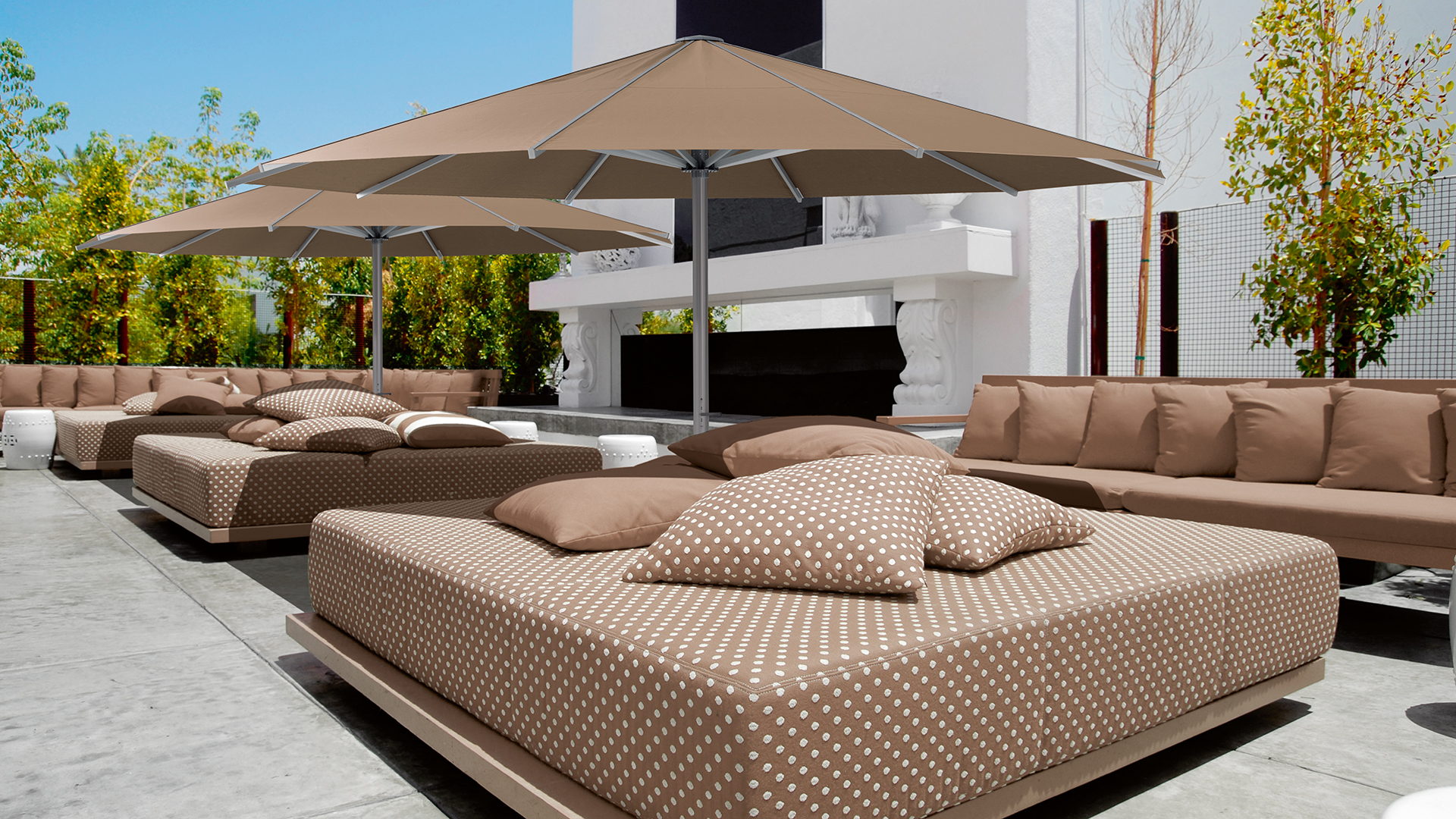 Dieser Grossraumschirm überzeugt mit Leistungsstärke und einfacher Handhabung: Je nach Schirmgrösse hält der PALAZZO® Noblesse Windgeschwindigkeiten von bis zu 90 km / h stand, was zahlreiche Tests im Windkanal bestätigen. Der PALAZZO® Noblesse lässt sich mit nur 12 Kurbelumdrehungen per Hand oder wahlweise mit integriertem Motor per Funk öffnen und schliessen. Aufgrund seiner Konstruktion sowie der hochwertigen Stoffqualität aus durchgefärbten Acrylfasern ist er nicht nur windbeständig: Er bietet auch optimalen Schutz vor Sonne und Regen und behält seine Farbfrische über Jahre. Der PALAZZO® Noblesse ist in 14 Standardausführungen – optional mit Kurbel, Motorantrieb, Heizung und Beleuchtung – erhältlich. Individuelle Anfertigungen sind auf Bestellung in fast jeder Grösse und Form möglich.